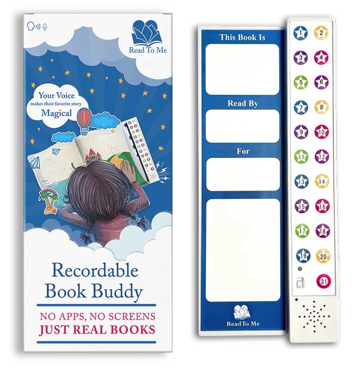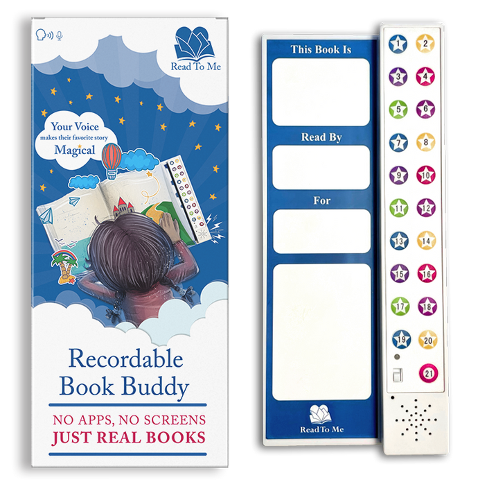 A quality built-in microphone allows you to record each page (or spread) to one of 21 buttons. Affix the included matching page stickers to show which button to press, and when. Attach the Book Buddy to the back cover, and the child in your life can hear you read to them anytime they like- no apps or screens required.